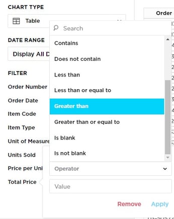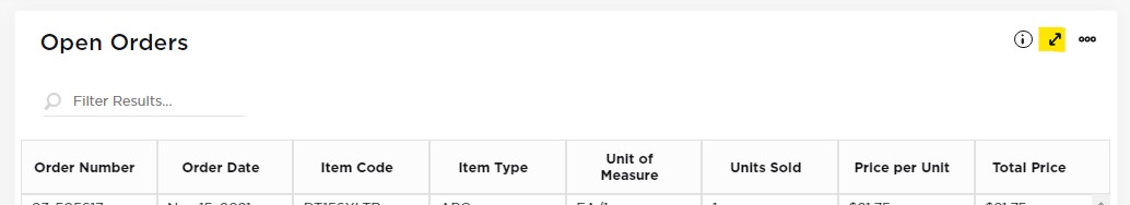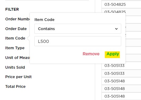 - You can also filter by making selections from the items shown under "FILTER". For example, you could filter the list of open orders to only show items with "L500" in the item code.