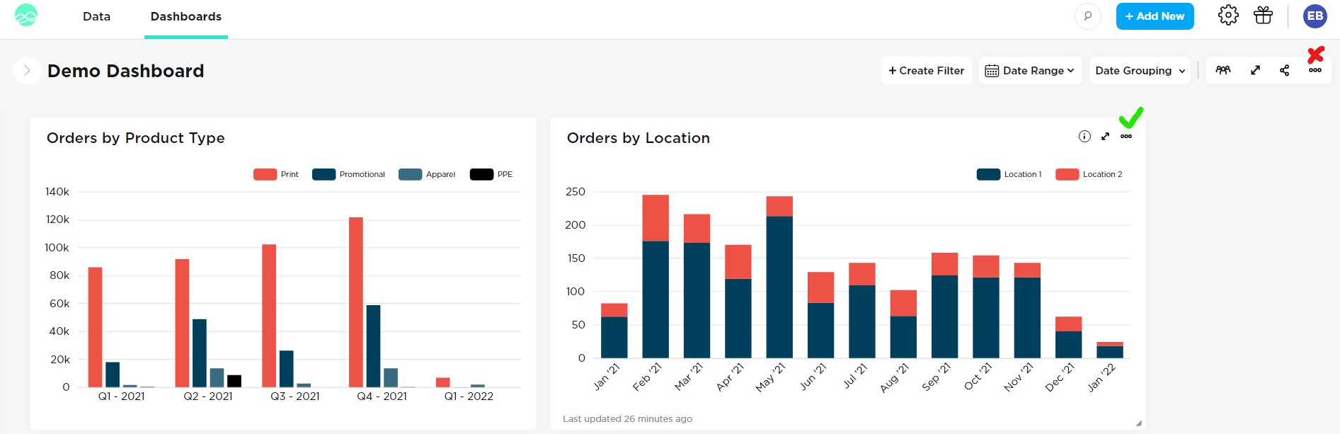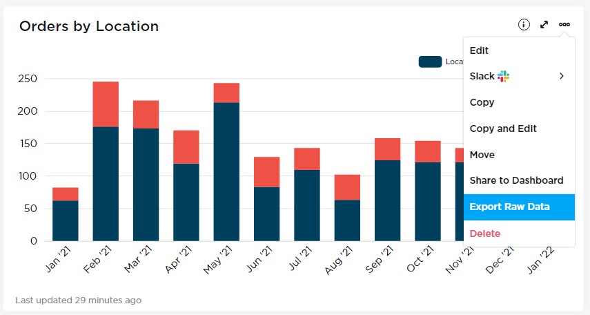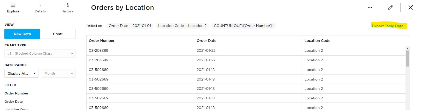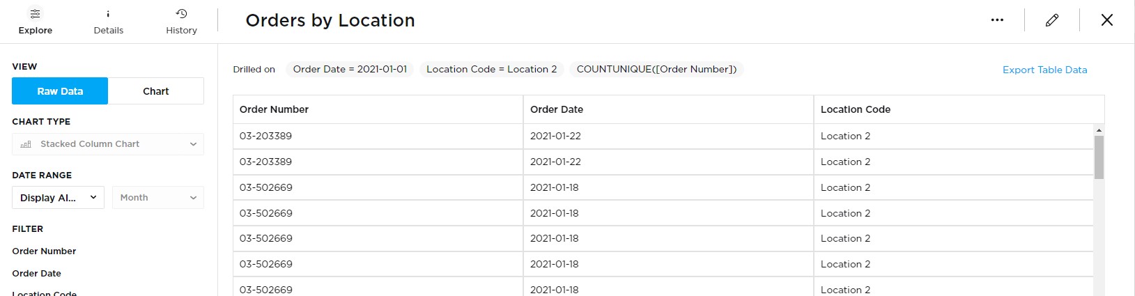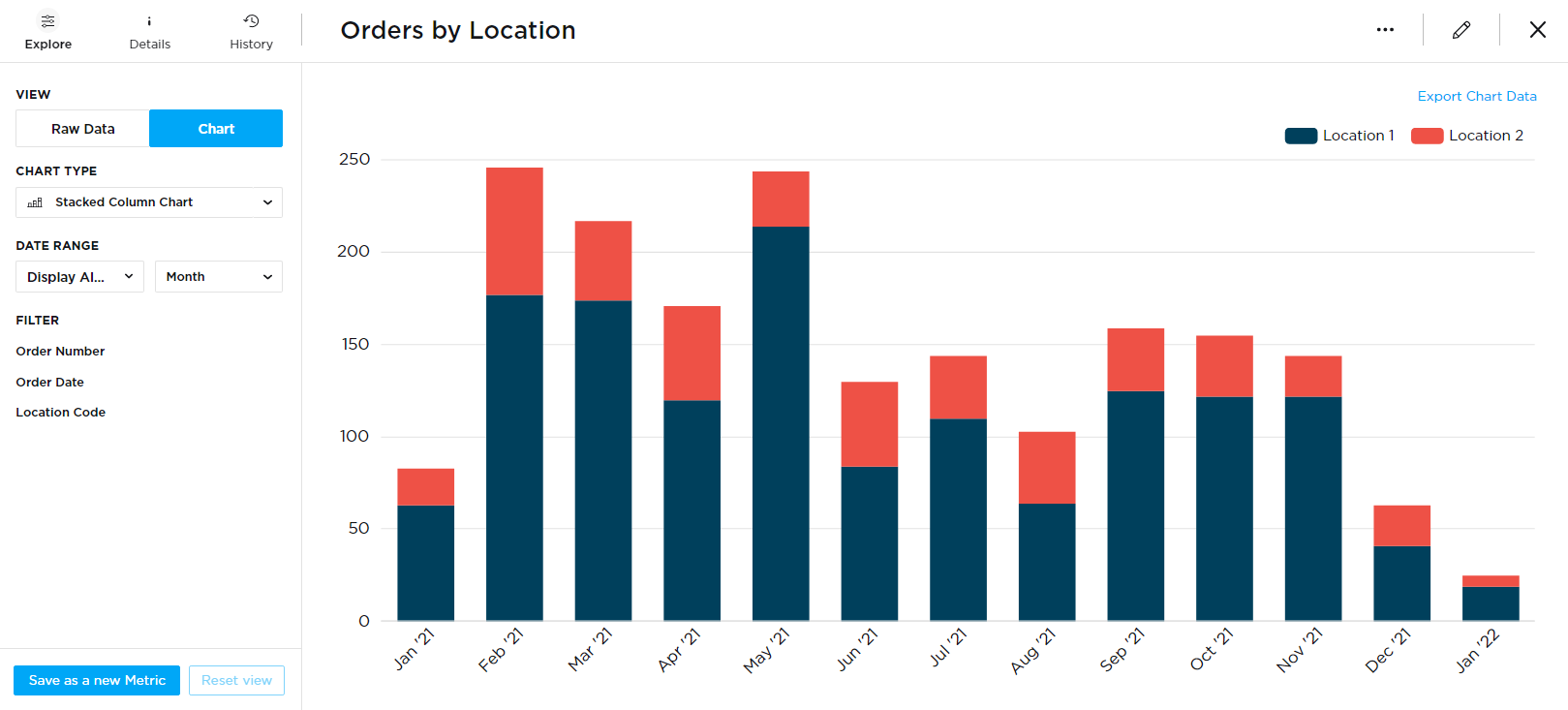 - You can click on the graph to drill in to more detail. For example, clicking the red section on the first bar will show the orders placed by Location 2 in Jan '21.