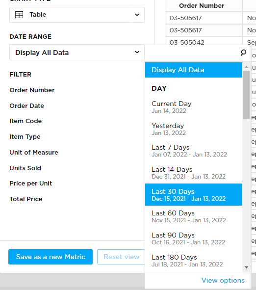 - Filters are available from the left sidebar. You can change the date range by selecting an option from the drop down.
